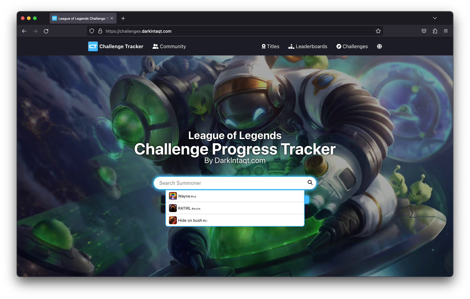 DarkIntaqt's Challenge Tracker is a versatile and comprehensive tool that offers players an efficient way to get in-depth insights on their challenge progress. You can quickly get an overview of the rank-up requirements for your challenges and their associated titles, view visualizations of your general progress and even game- or date-based breakdowns of your recent activity.