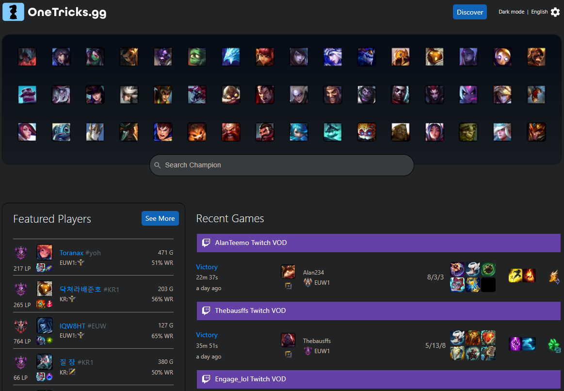 OneTricks.gg offers build and matchup information for each champion, derived from high elo one trick players. This allows players to get in-depth insights on what signature builds can be found among the best and what the general consensus on the best rune and itemization choices are.