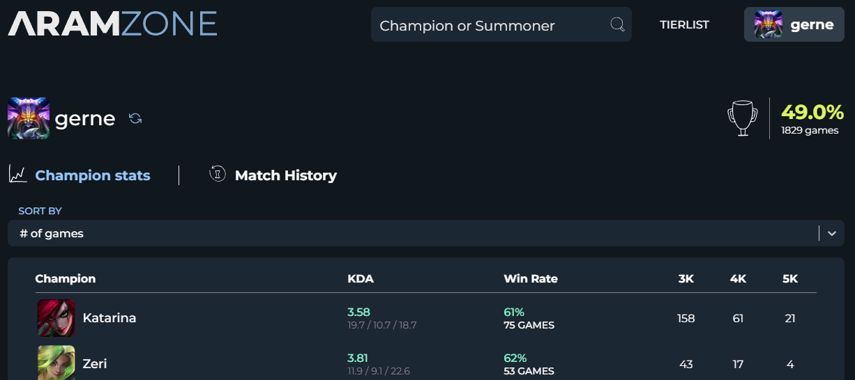 ARAM Zone is a site with stats focused on All Random All Mid. You can view your personal stats with game count, winrates, average KDA and multikills. There's also a champion tierlist that allows you to quickly access the most popular and highest winrate builds for each champion.